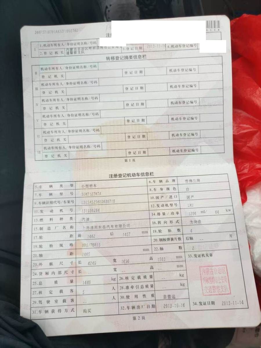 初次登记日期 2013-11-14 车辆名称 雪佛兰 赛欧