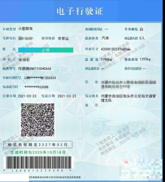 车牌号 蒙****** 品牌 传祺