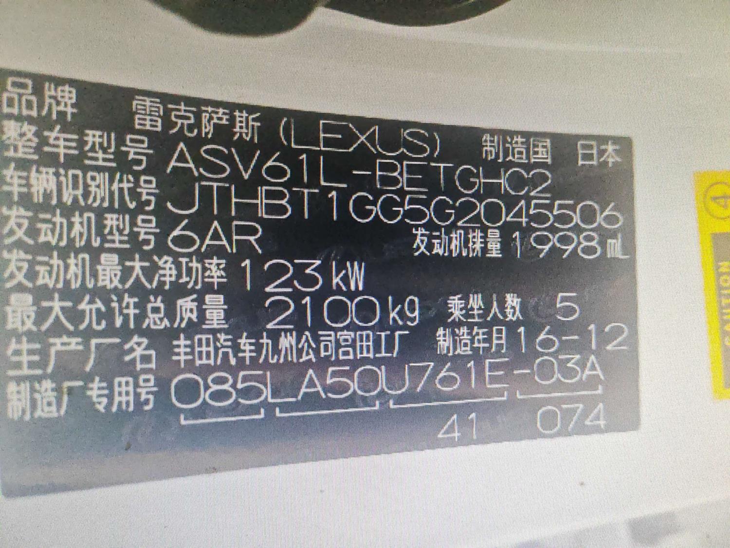 底盘号码 JTHBT1GG5G2045506 变速箱类型 手自一体