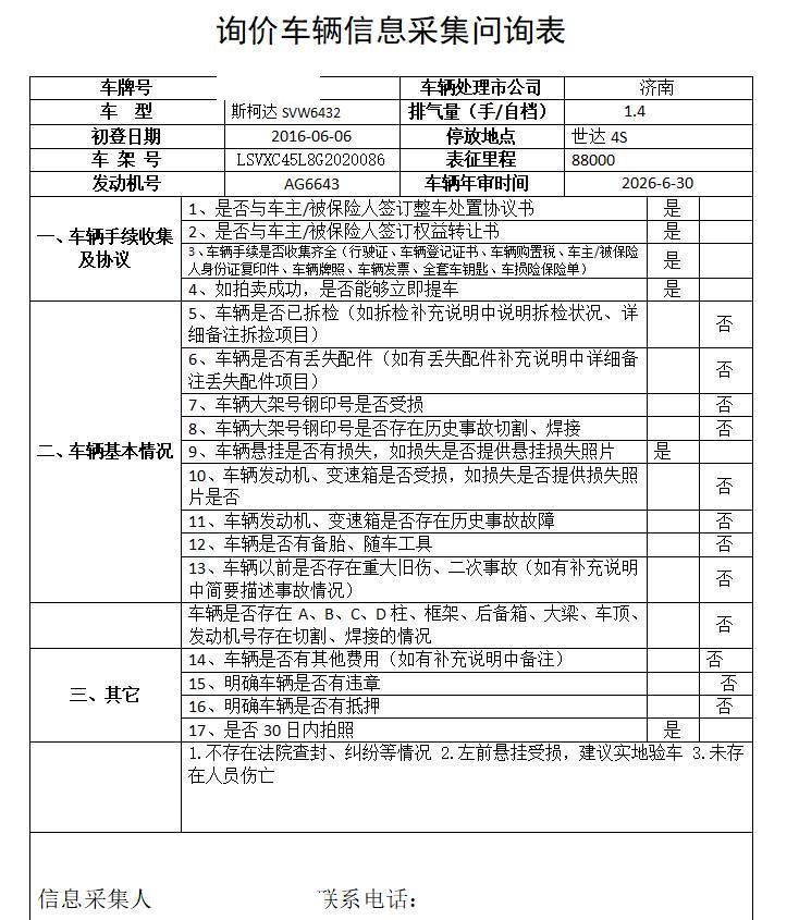 1.不存在法院查封、纠纷等情况 2.左前悬挂受损,建议实地验车 3.未存在人员伤亡 5年以上车辆报价后不得以二次事故为由提出议价或退车弃标。