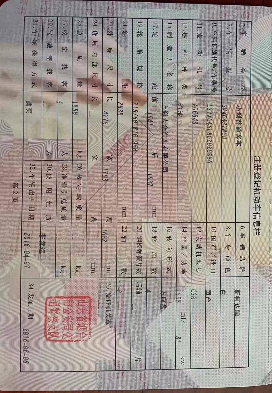 初次登记日期 2016-06-06 车辆名称 斯柯达 Yeti