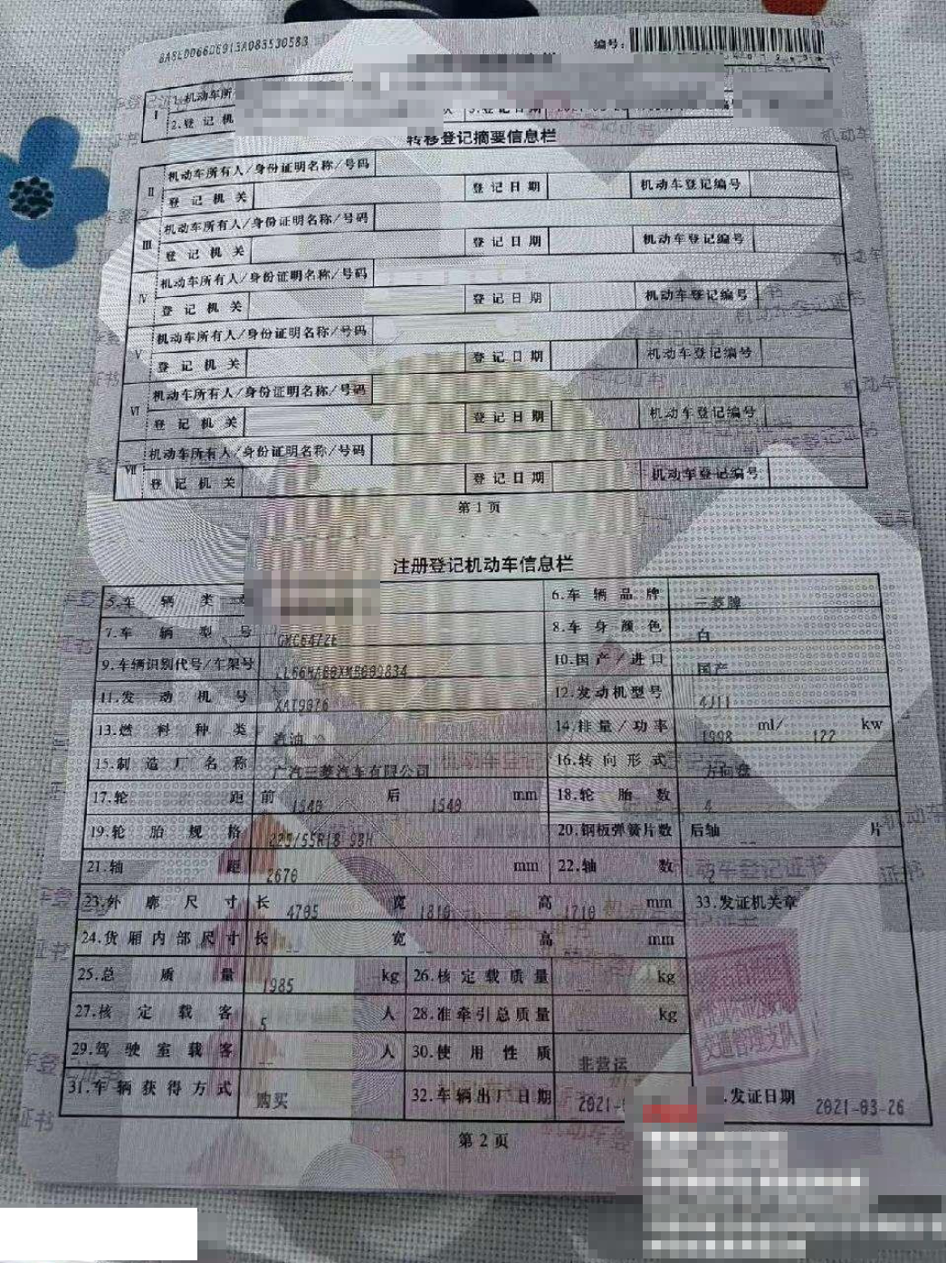 初次登记日期 2021-03-26 车辆名称 三菱 欧蓝德