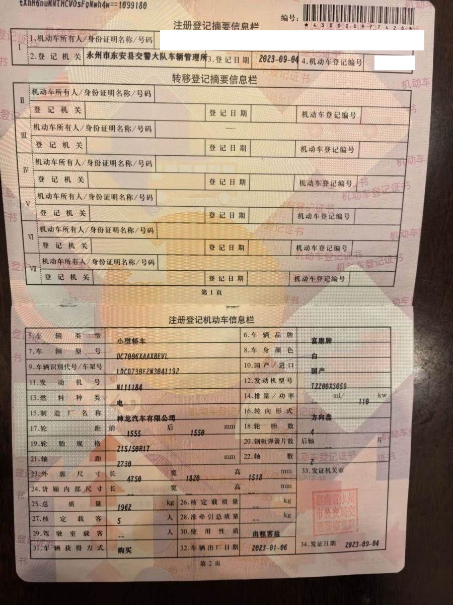 初次登记日期 2023-09-04 车辆名称 东风富康