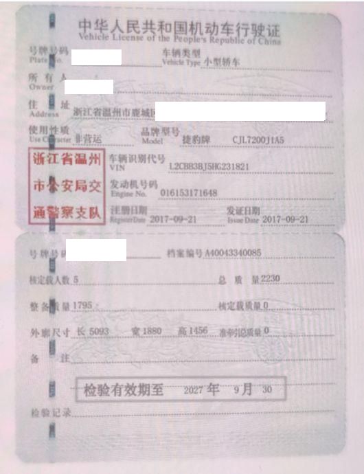 车辆归属地 浙江省温州市 车辆停放仓库 浙江省温州市温州市