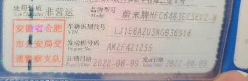 初次登记日期 2022-06-09 车辆名称 蔚来牌