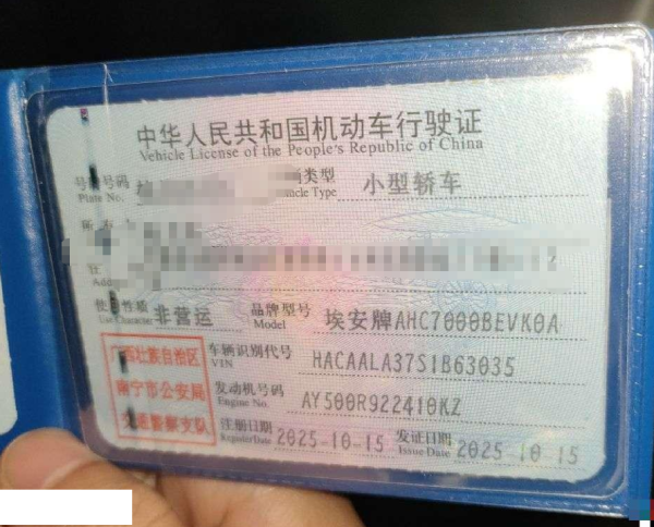 初次登记日期 2025-10-15 车辆名称 埃安 AION RT