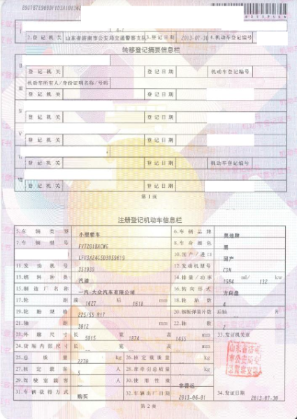 初次登记日期 2013-07-30 车辆名称 奥迪A6L