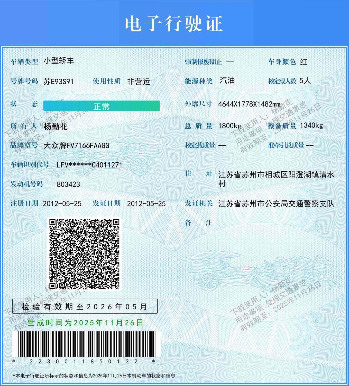 车辆归属地 江苏省苏州市 车辆停放仓库 江苏省苏州市苏州市