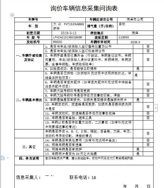 车架号是否受损 使用性质 非营运