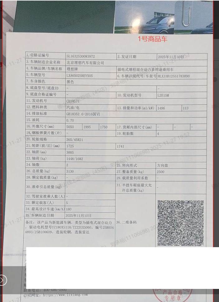 初次登记日期 2025-11-27 车辆名称 理想汽车