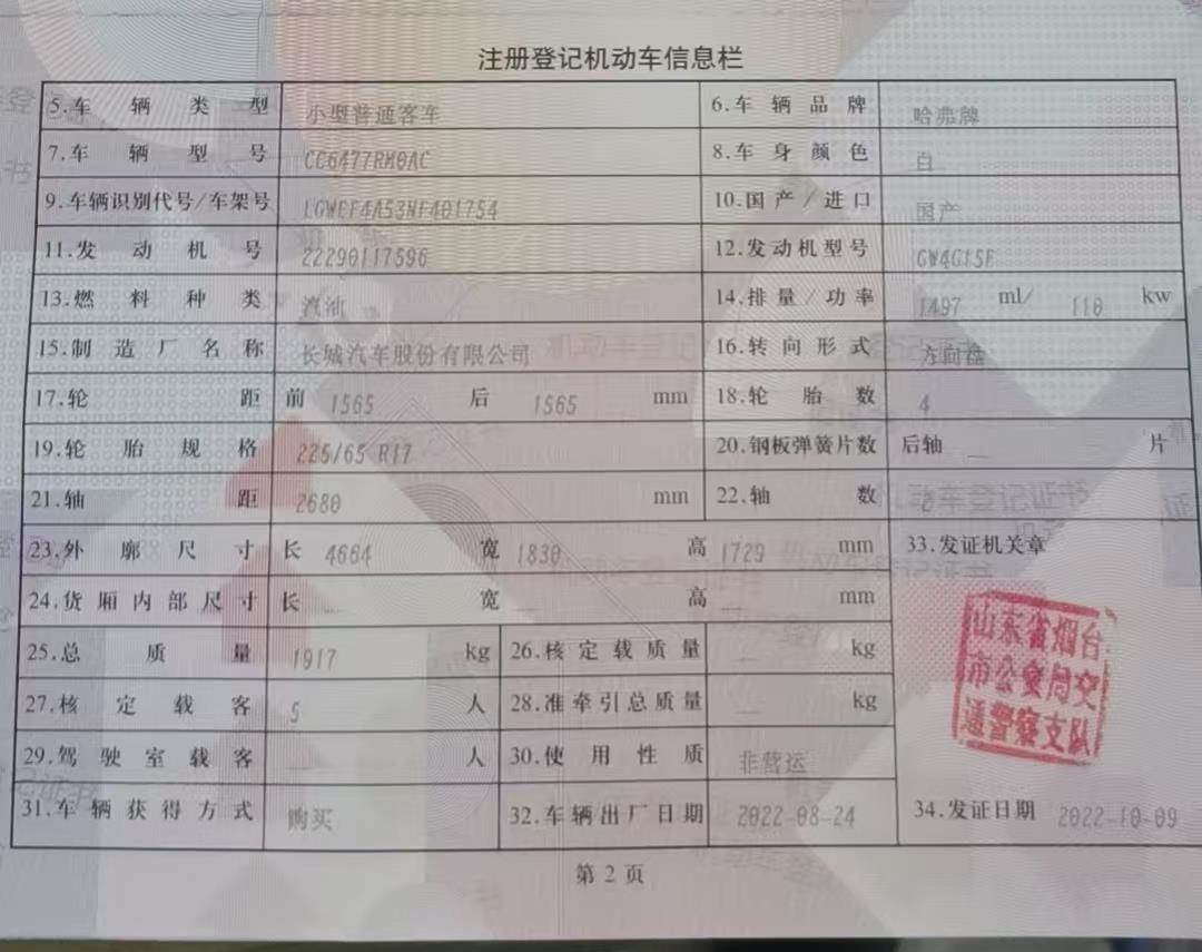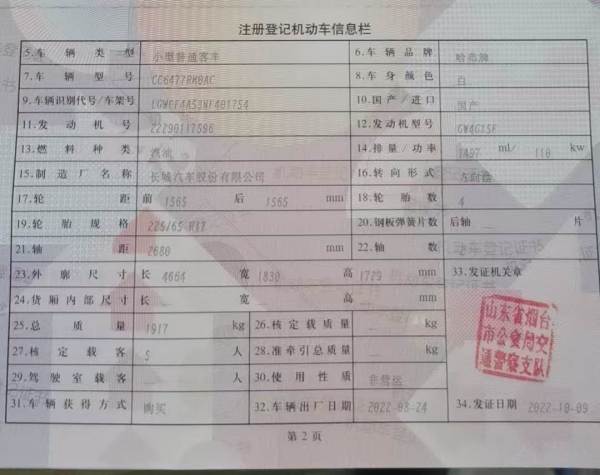 初次登记日期 2022-10-09 车辆名称 哈弗M6