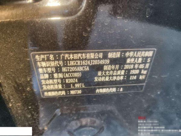 初次登记日期 2018-09-30 车辆名称 本田 雅阁