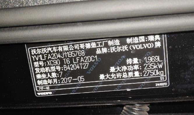 初次登记日期 2017-11-07 车辆名称 沃尔沃XC90