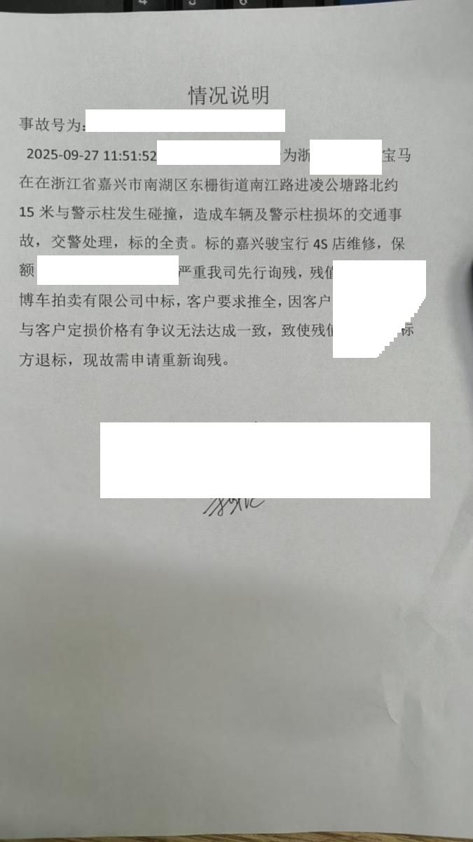 车在嘉兴骏宝行,情况说明已上传在损余拍卖照片项,客户推全金额诉求高,无法达成一致,导致残值过期 5年以上车辆报价后不得以二次事故为由提出议价或退车弃标。 二手车交易费发票金额低于拍卖成交金额开具(不含手续费及其他费用)。