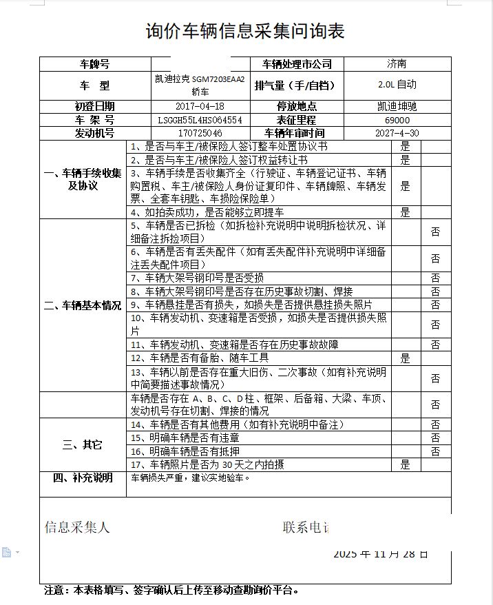 车架号是否受损 未知 使用性质 非营运