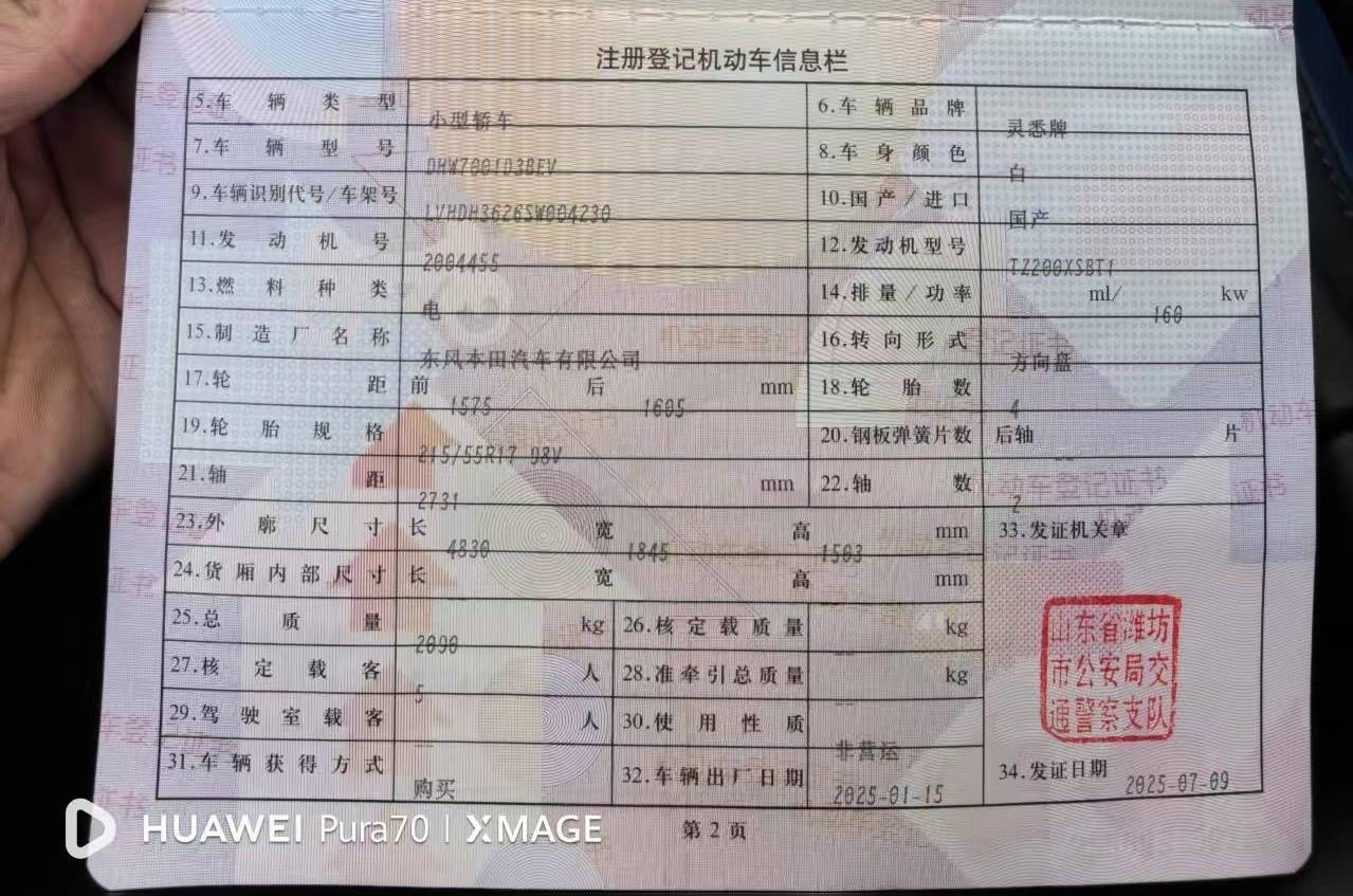 初次登记日期 2025-07-09 车辆名称 灵悉L