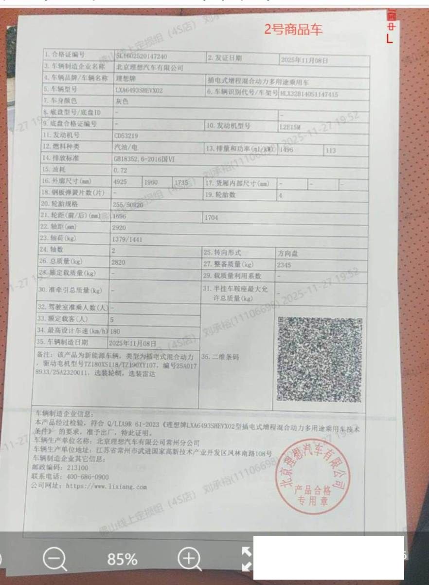 初次登记日期 2025-11-28 车辆名称 理想汽车