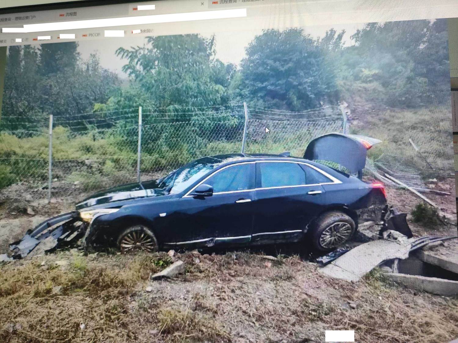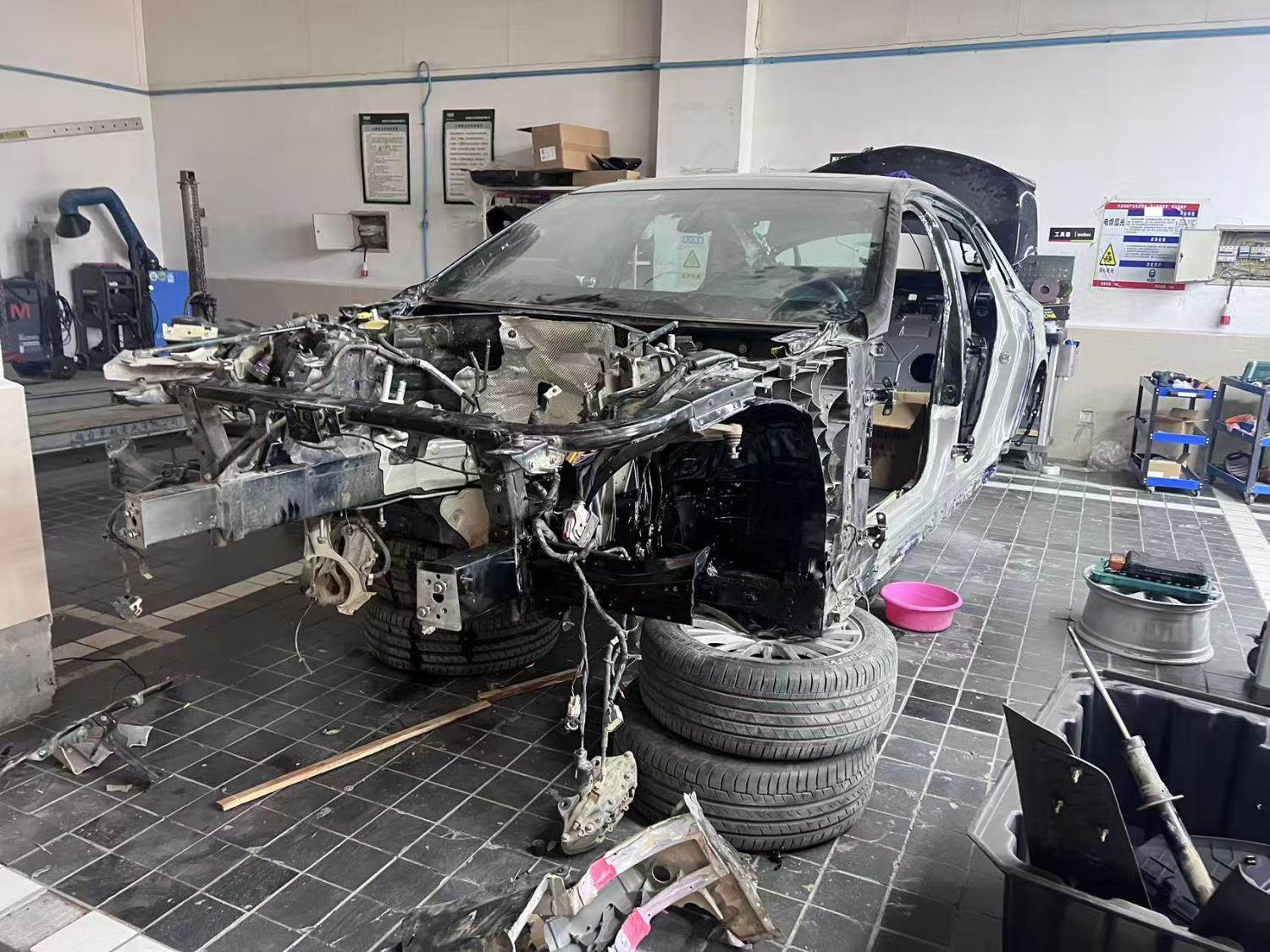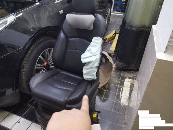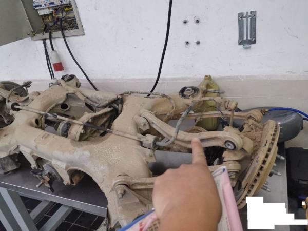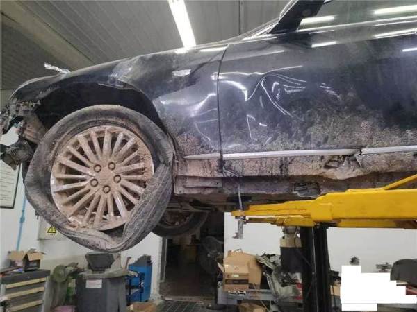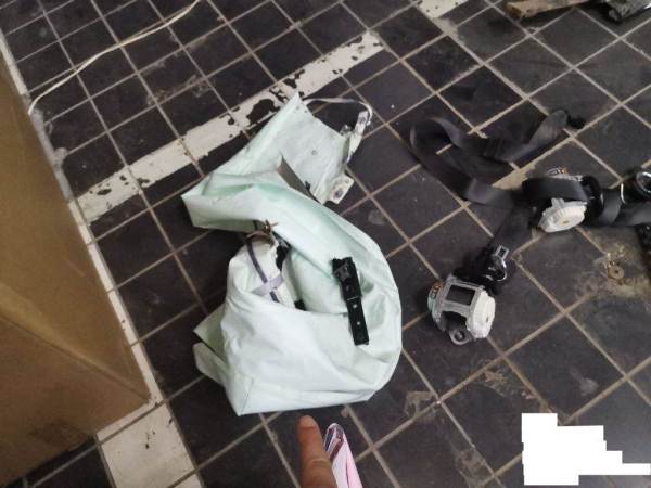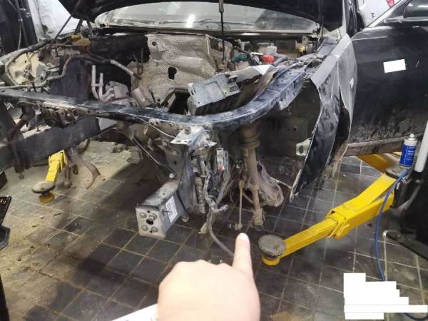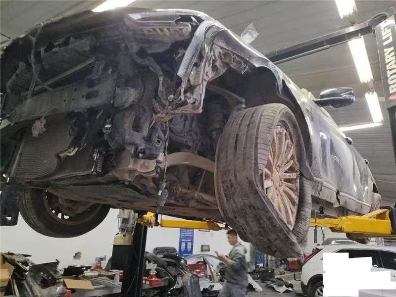 侧气帘已打开,车辆已拆检部位:前杠,大灯,机盖,发动机,变速箱,元宝梁,后杠,水箱,冷凝器,左前门,左后门,叶子板,排气管,方向机,差速器,油箱,后桥,减震。
