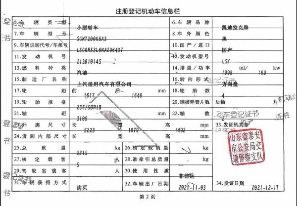 初次登记日期 2021-12-17 车辆名称 凯迪拉克CT6