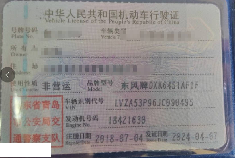 车辆归属地 山东省青岛市 车辆停放仓库 山东省青岛市