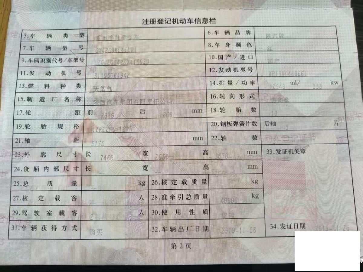 初次登记日期 2019-11-08 车辆名称 陕汽 德龙