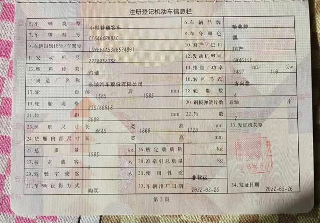 初次登记日期 2022-05-20 车辆名称 哈弗H6