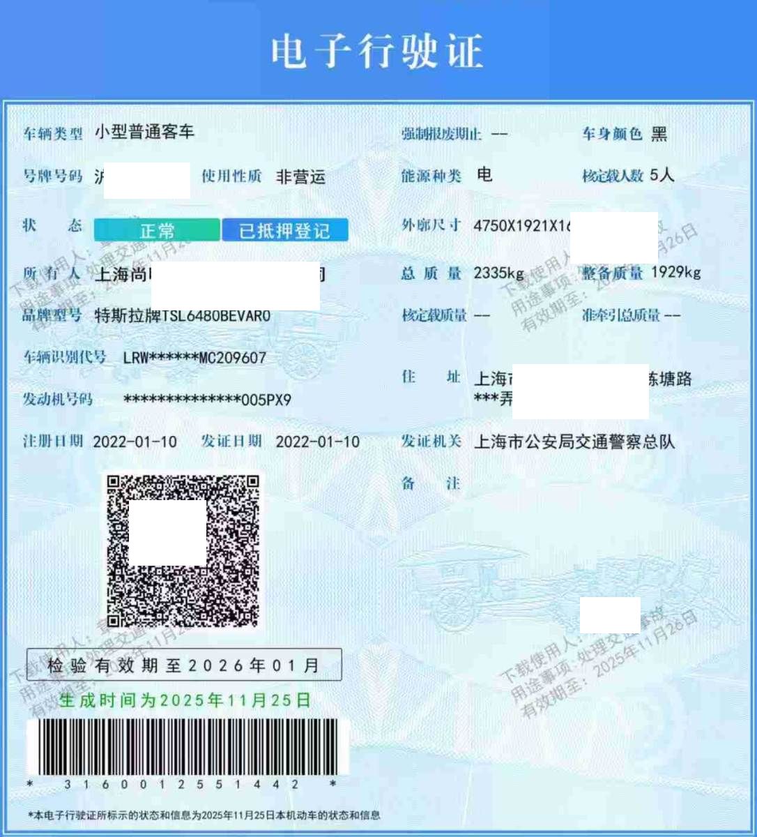 车牌号 沪****** 品牌 特斯拉