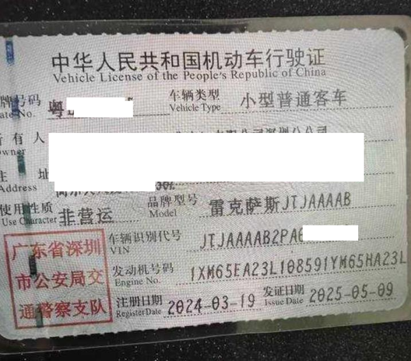 车牌号 粤****** 品牌 雷克萨斯