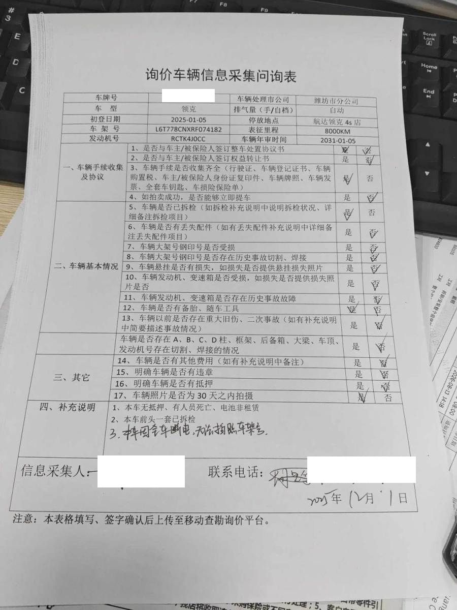 1、本车无抵押,有人员死亡,电池非租赁 2、本车前头一套已拆检 3、本车因全车断电,导致无法拍照车架号