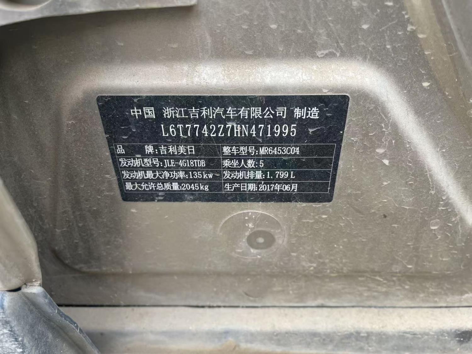 初次登记日期 2017-08-03 车辆名称 吉利汽车 博越