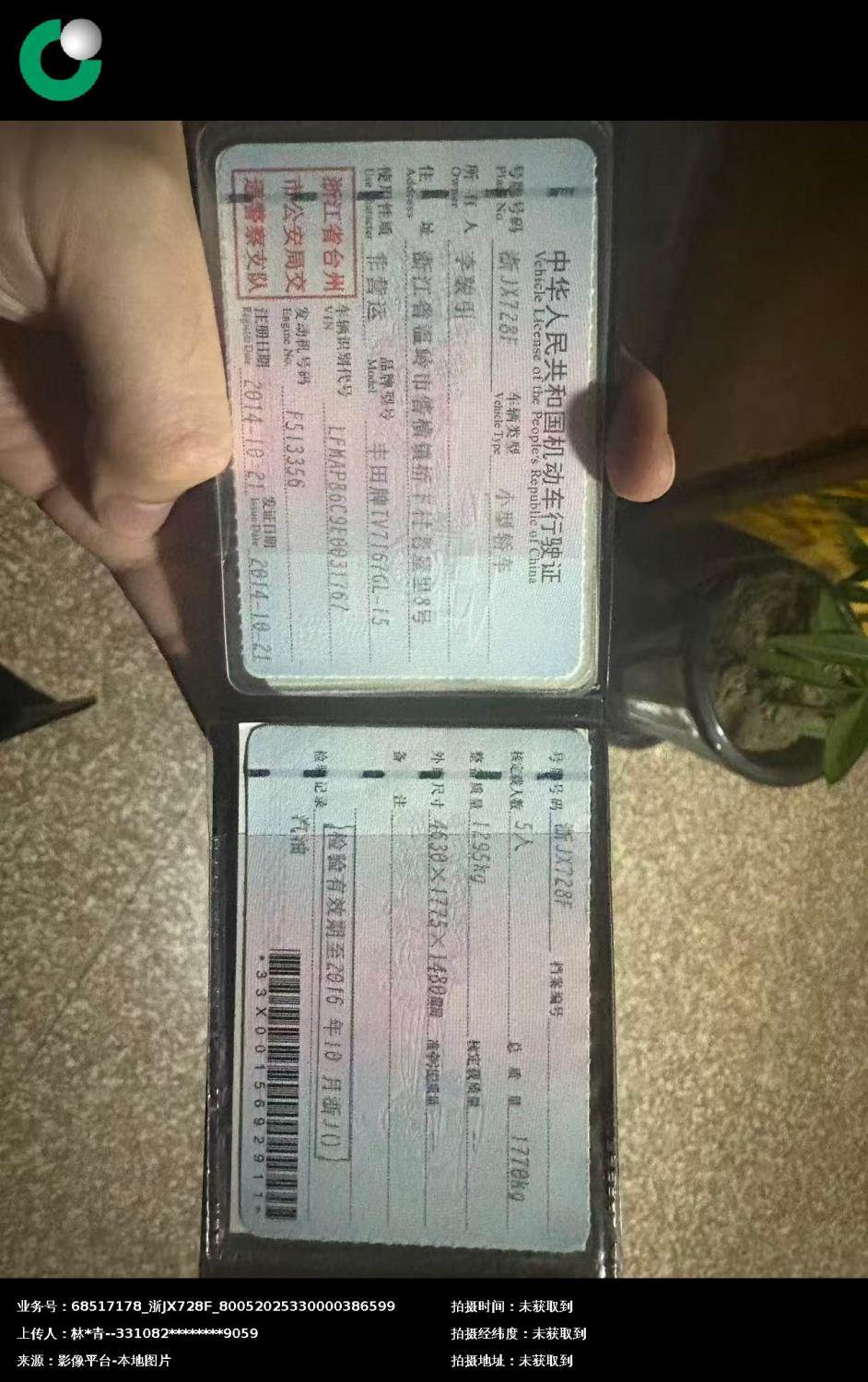 车辆归属地 浙江省台州市 车辆停放仓库 浙江省台州市路桥区
