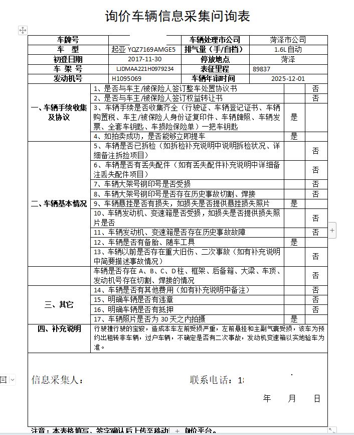 车架号是否受损 使用性质 非营运