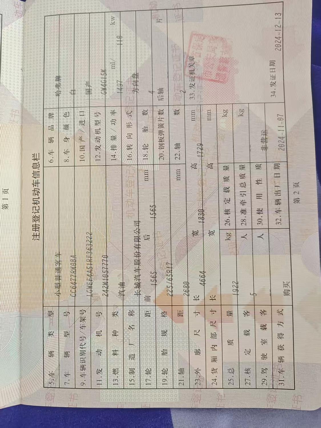初次登记日期 2024-12-13 车辆名称 哈弗M6