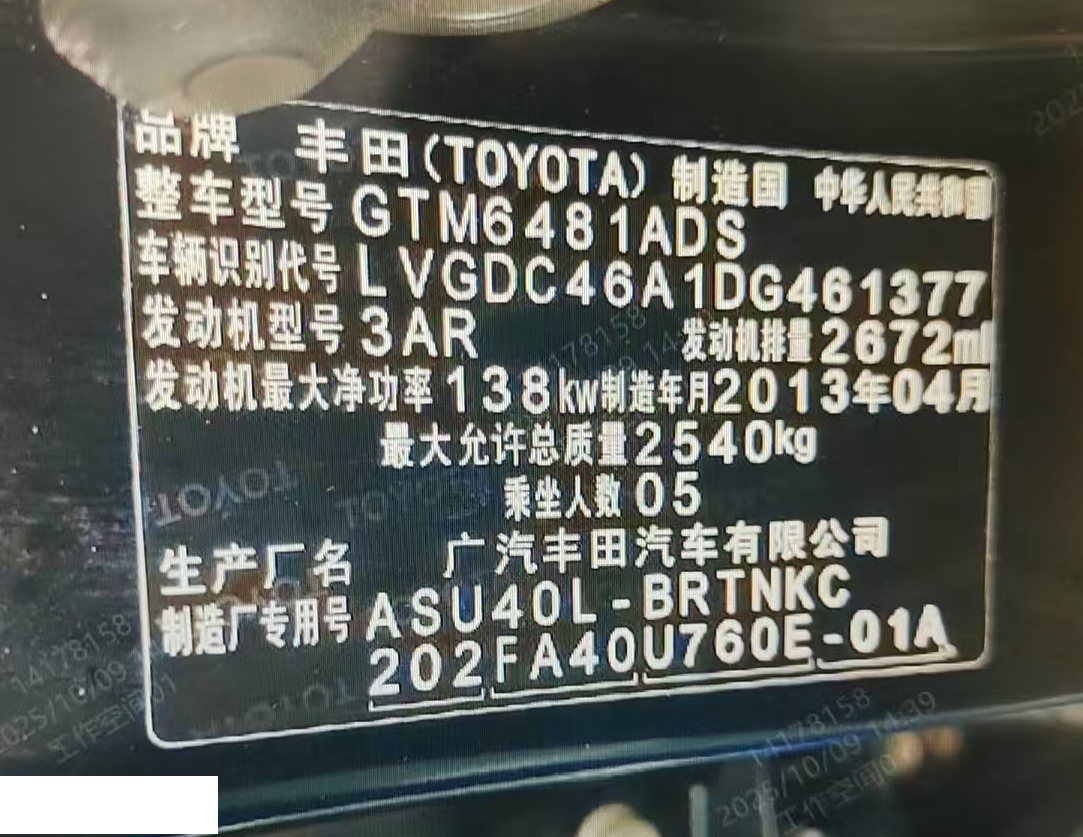 初次登记日期 2013-06-05 车辆名称 丰田 汉兰达