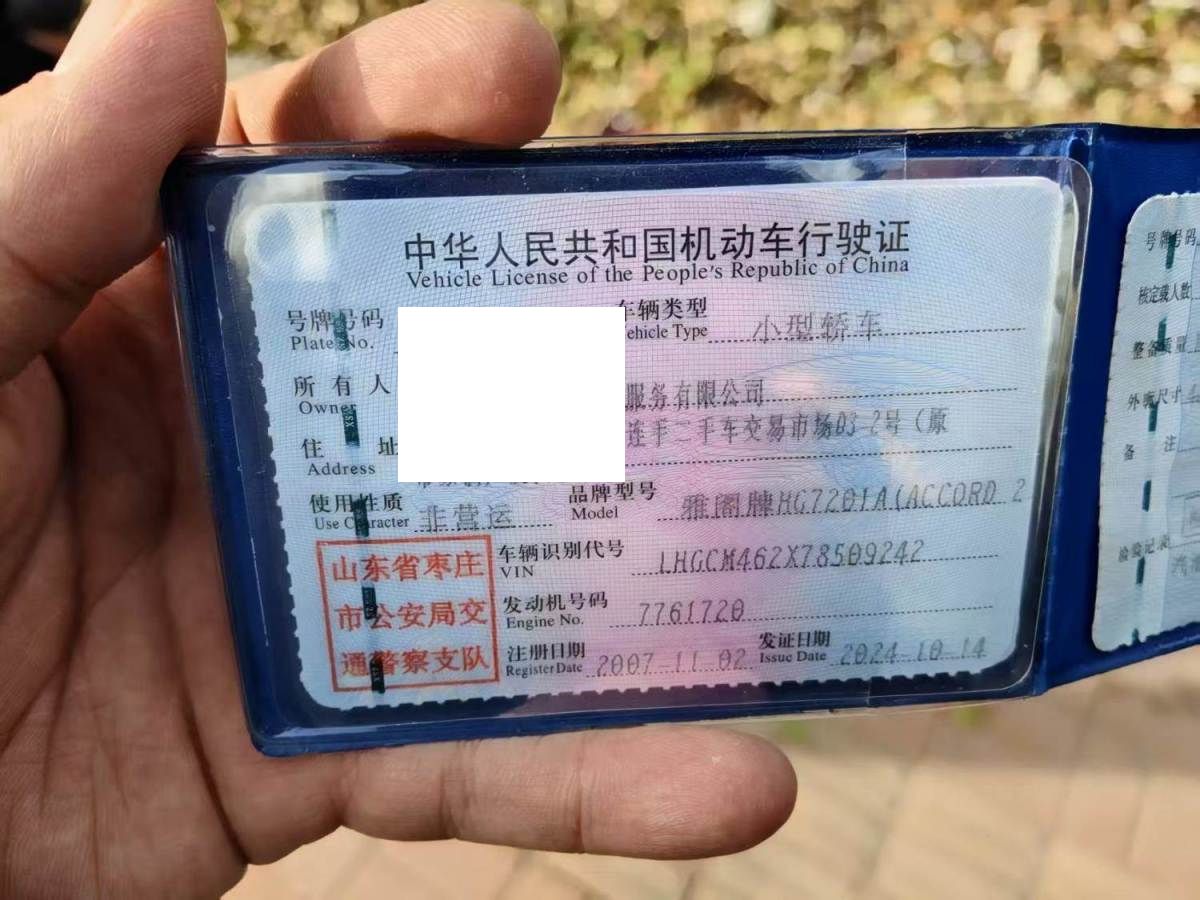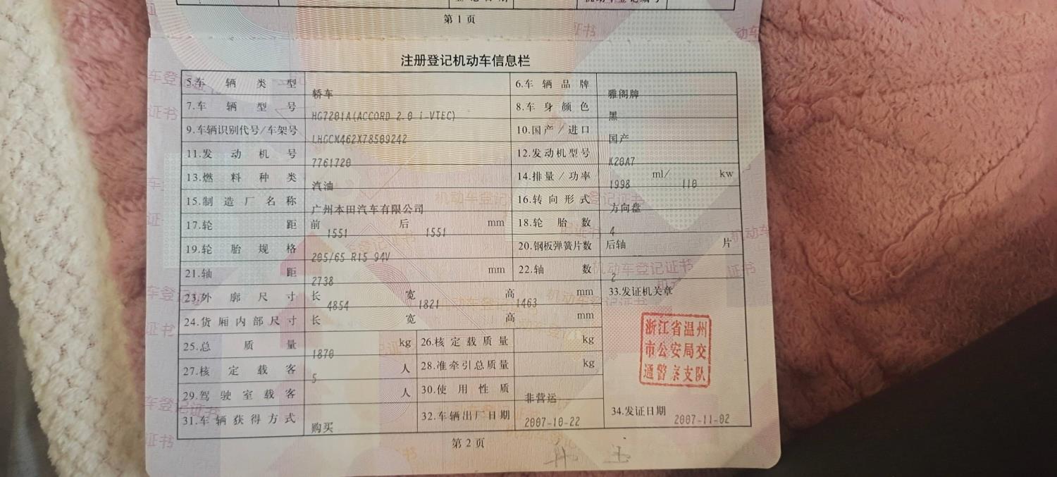 初次登记日期 2007-11-02 车辆名称 本田 雅阁