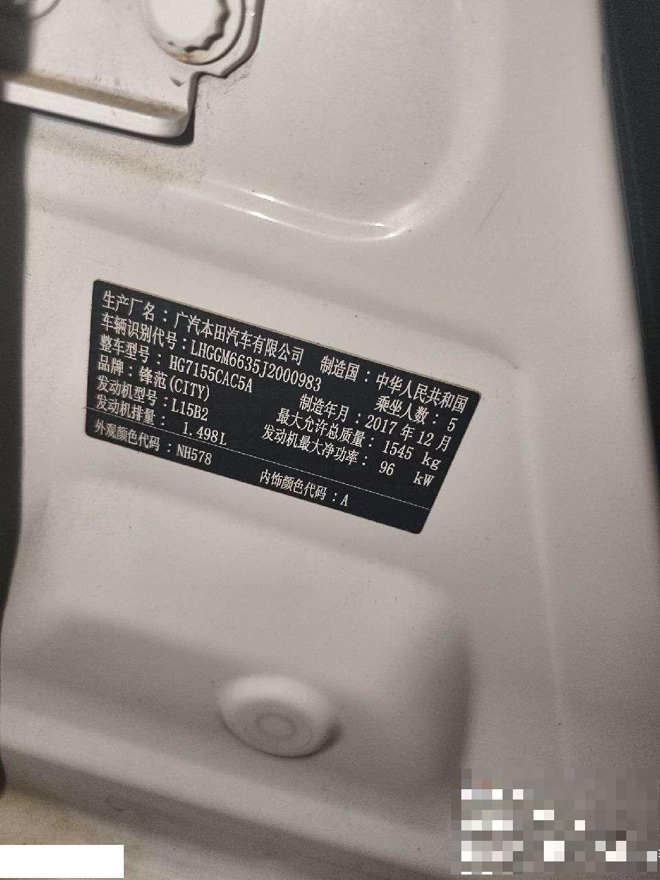 底盘号码 LHGGM6635J2000983 变速箱类型 自动