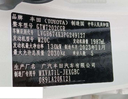 初次登记日期 2023-11-15 车辆名称 丰田 凯美瑞
