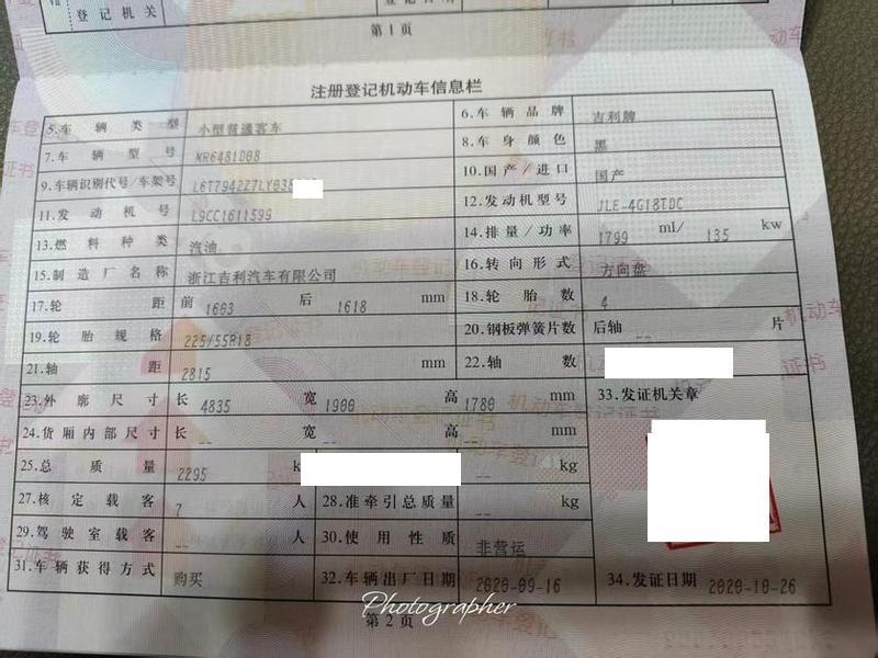 初次登记日期 2020-10-26 车辆名称 吉利汽车
