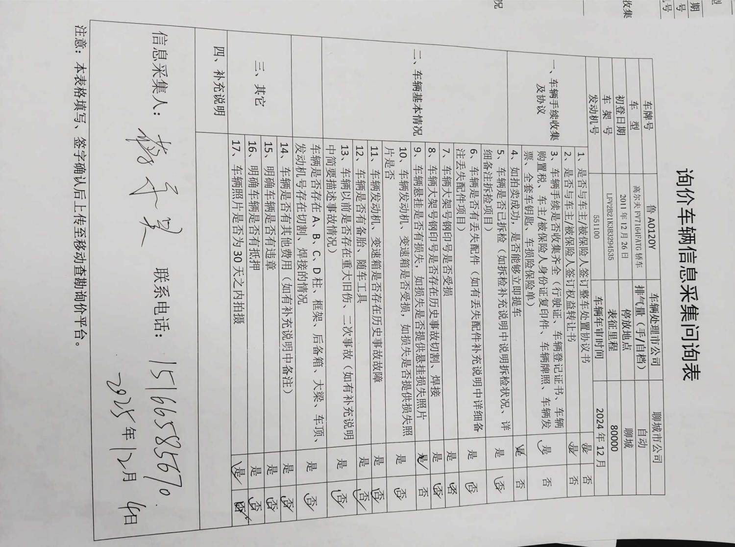车架号是否受损 使用性质 非营运