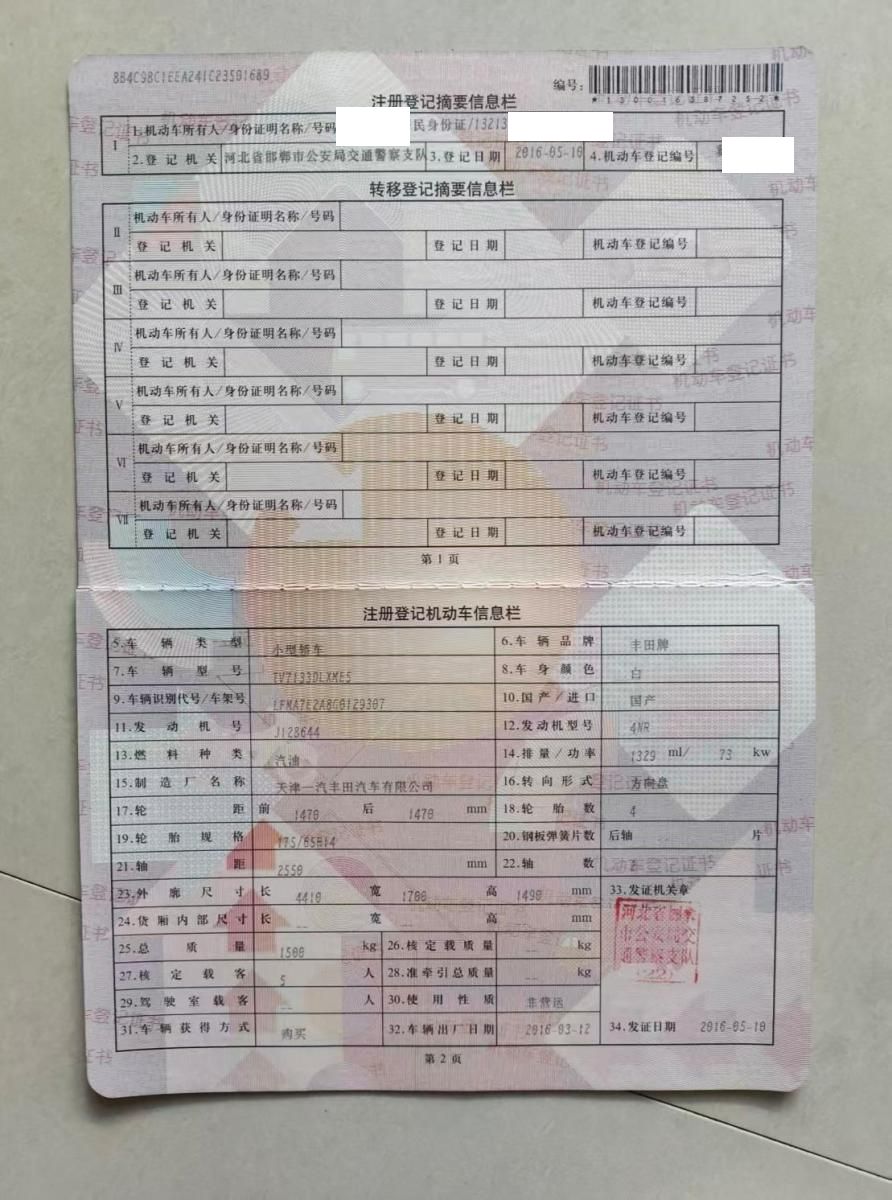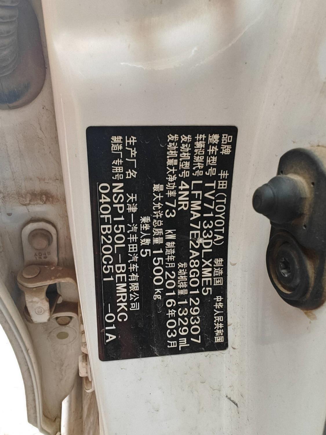 初次登记日期 2016-05-10 车辆名称 丰田 威驰