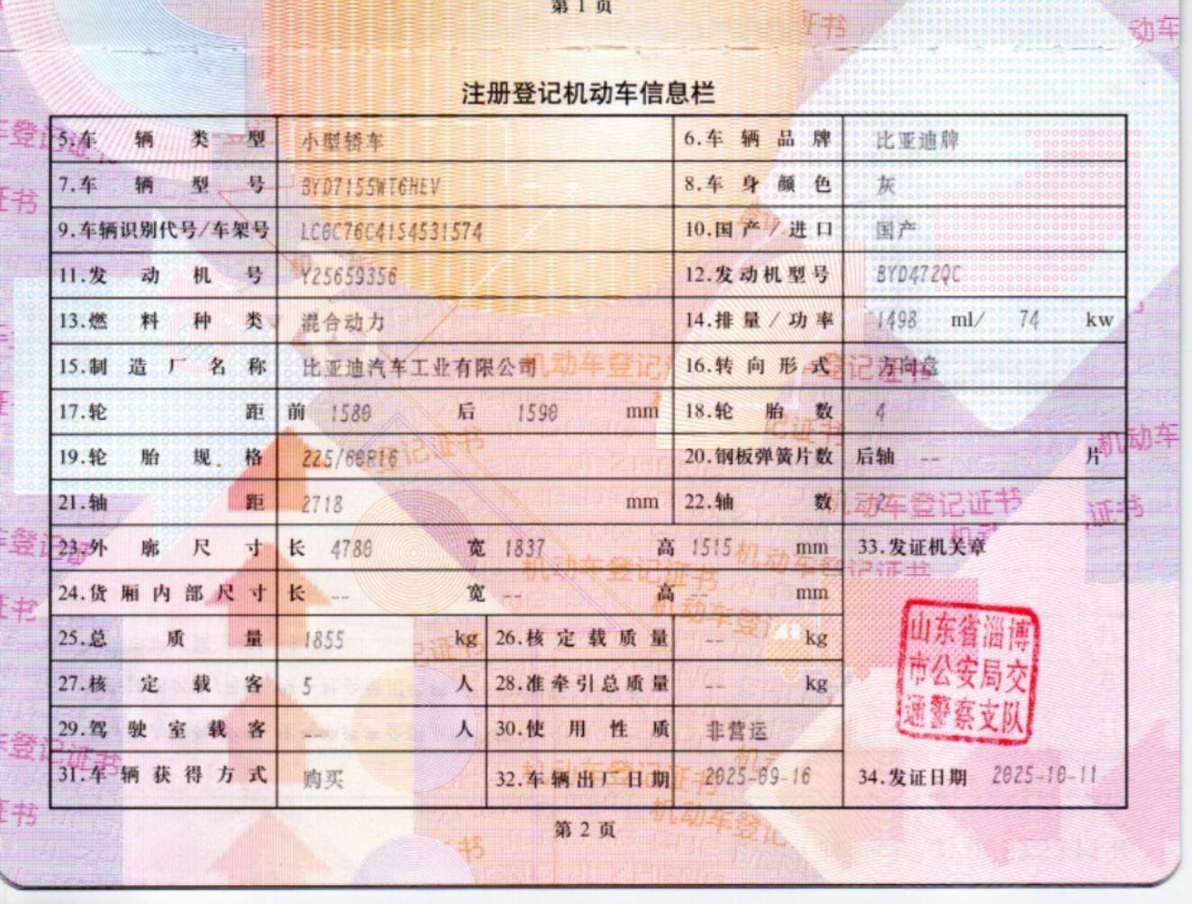 初次登记日期 2025-09-16 车辆名称 比亚迪