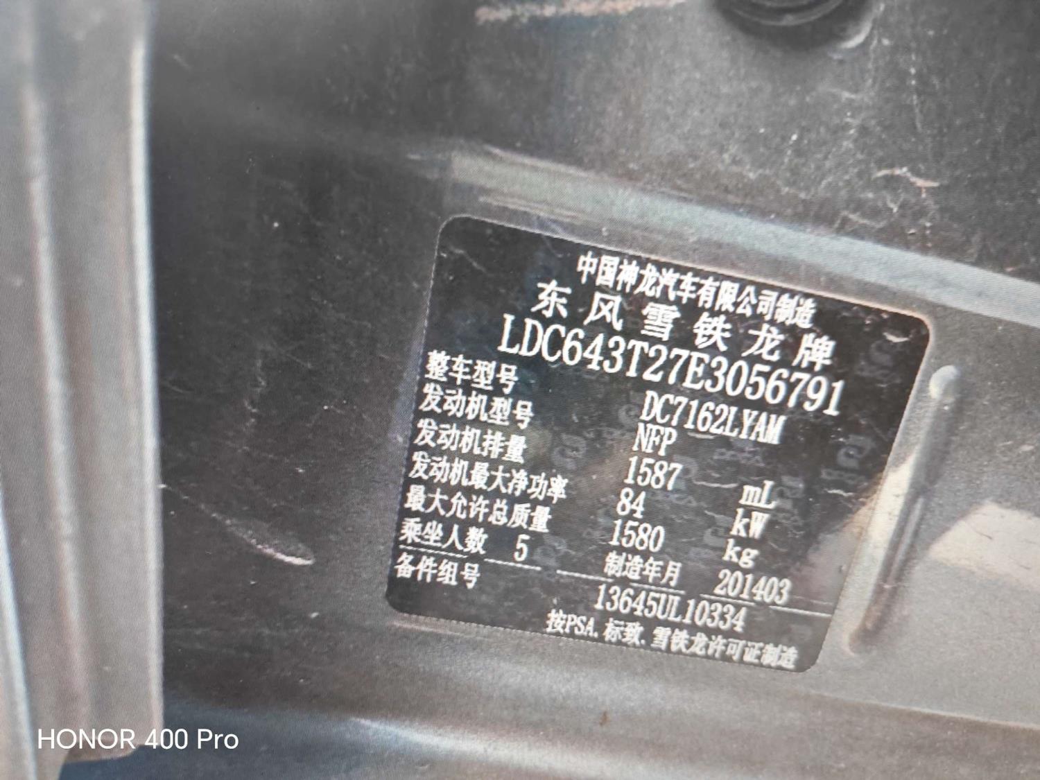 初次登记日期 2014-04-15 车辆名称 雪铁龙 爱丽舍