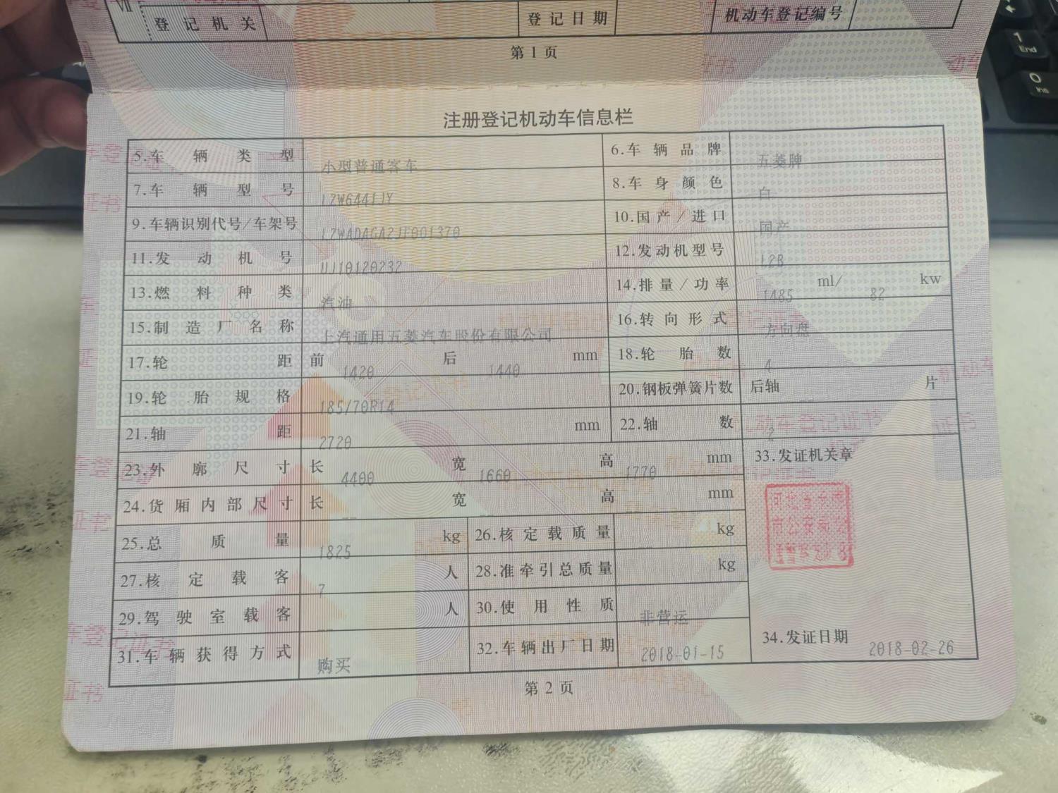 初次登记日期 2018-02-26 车辆名称 五菱汽车 五菱宏光