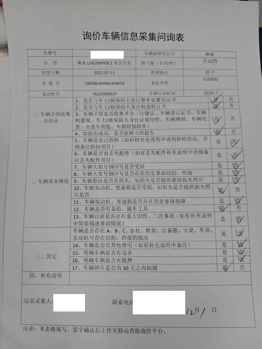 车架号是否受损 未知 使用性质 货运