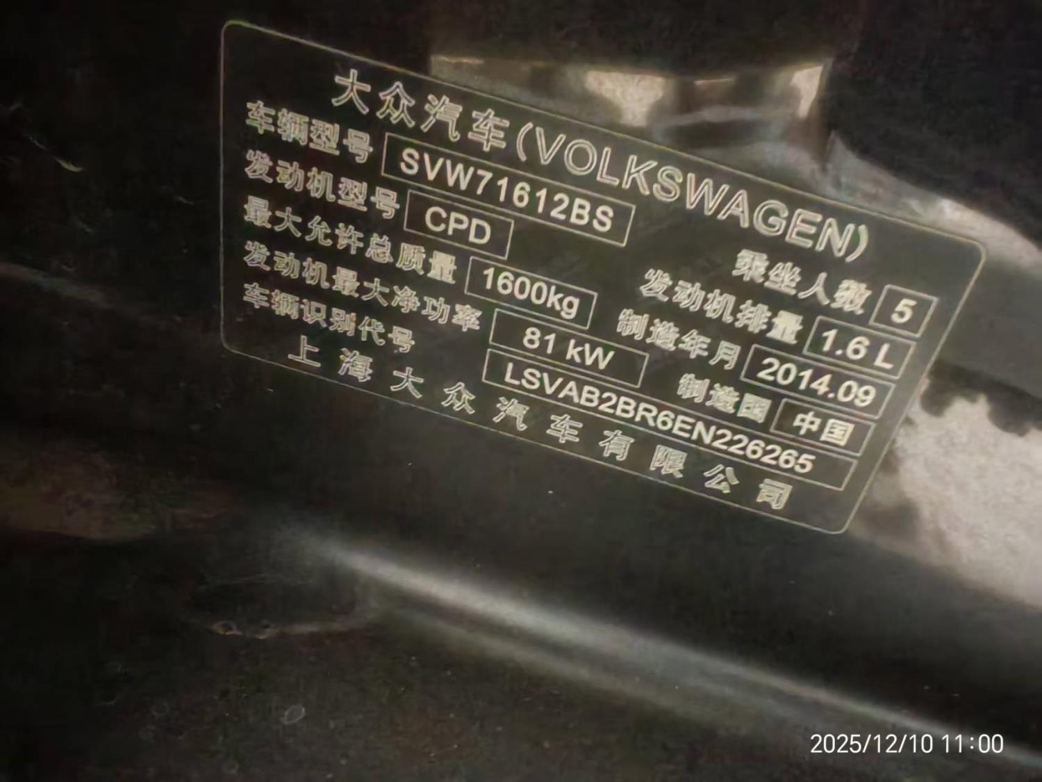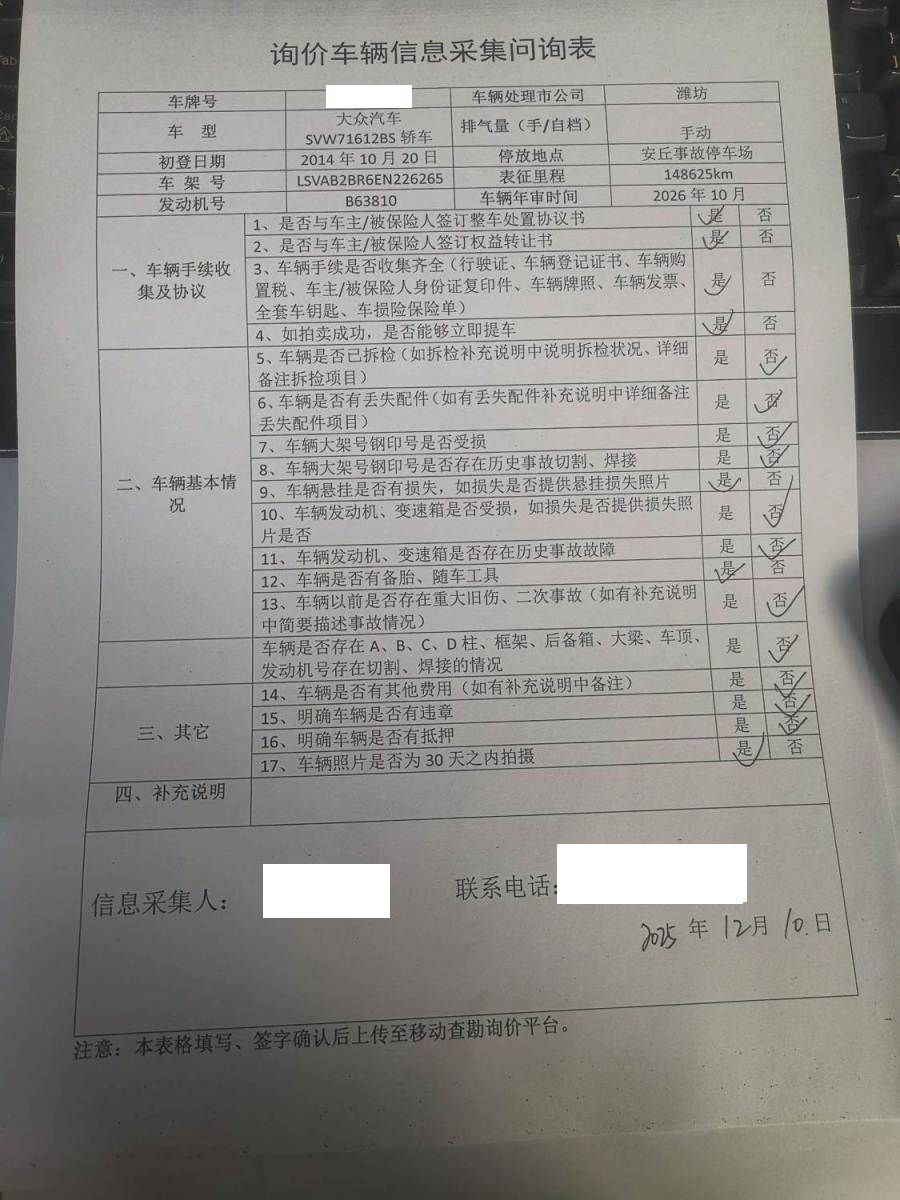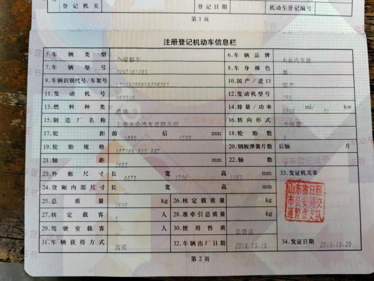 初次登记日期 2014-10-20 车辆名称 大众 桑塔纳