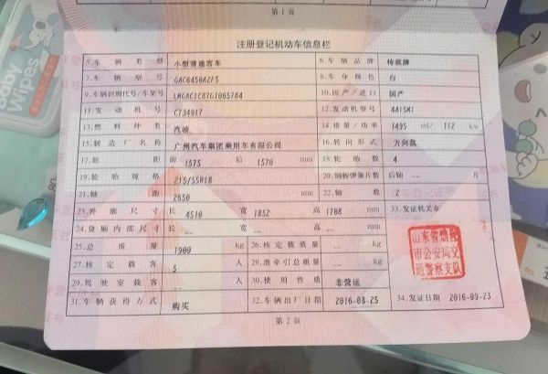 初次登记日期 2016-09-23 车辆名称 广汽传祺 传祺GS4