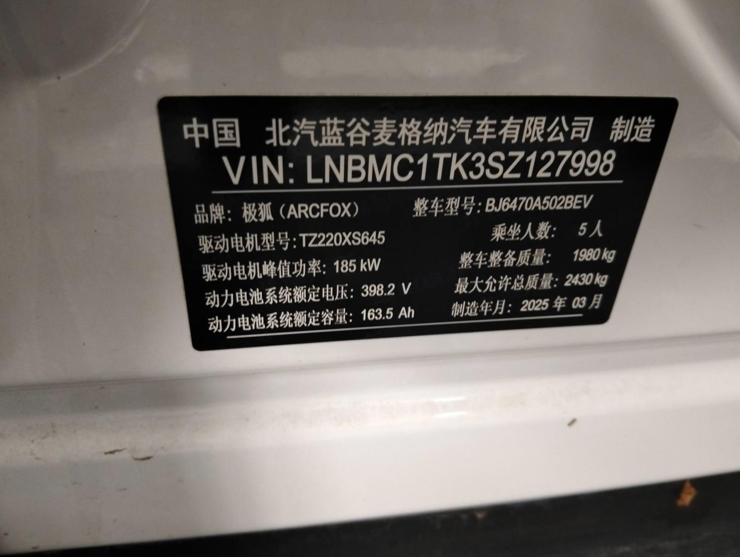 初次登记日期 2025-08-21 车辆名称 ARCFOX极狐 极狐 阿尔法