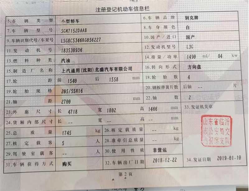 初次登记日期 2019-01-10 车辆名称 别克 威朗