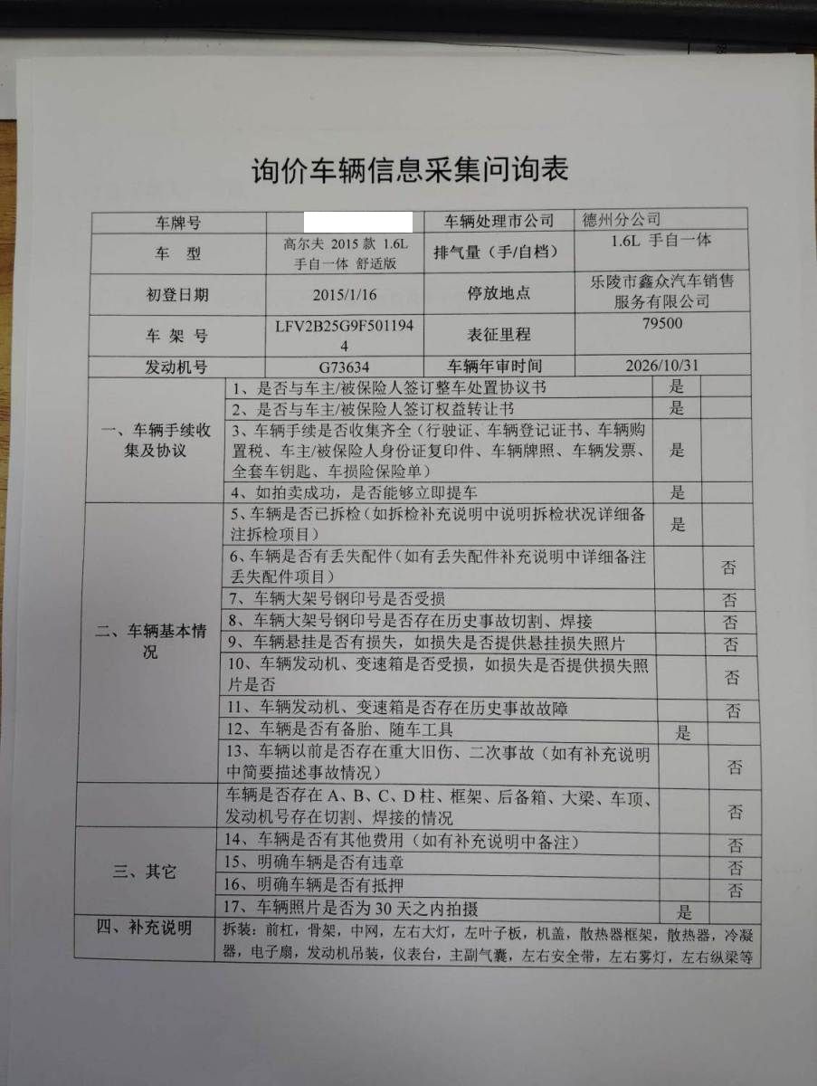 初次登记日期 2015-04-16 车辆名称 大众 高尔夫