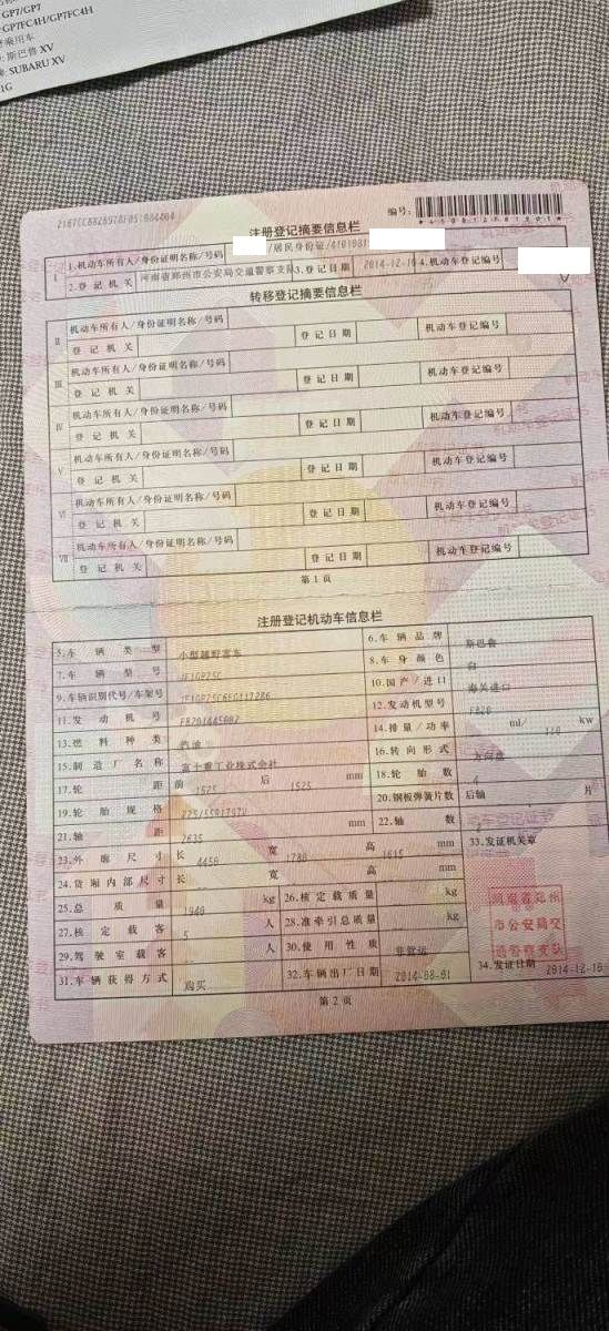 初次登记日期 2014-12-10 车辆名称 斯巴鲁XV